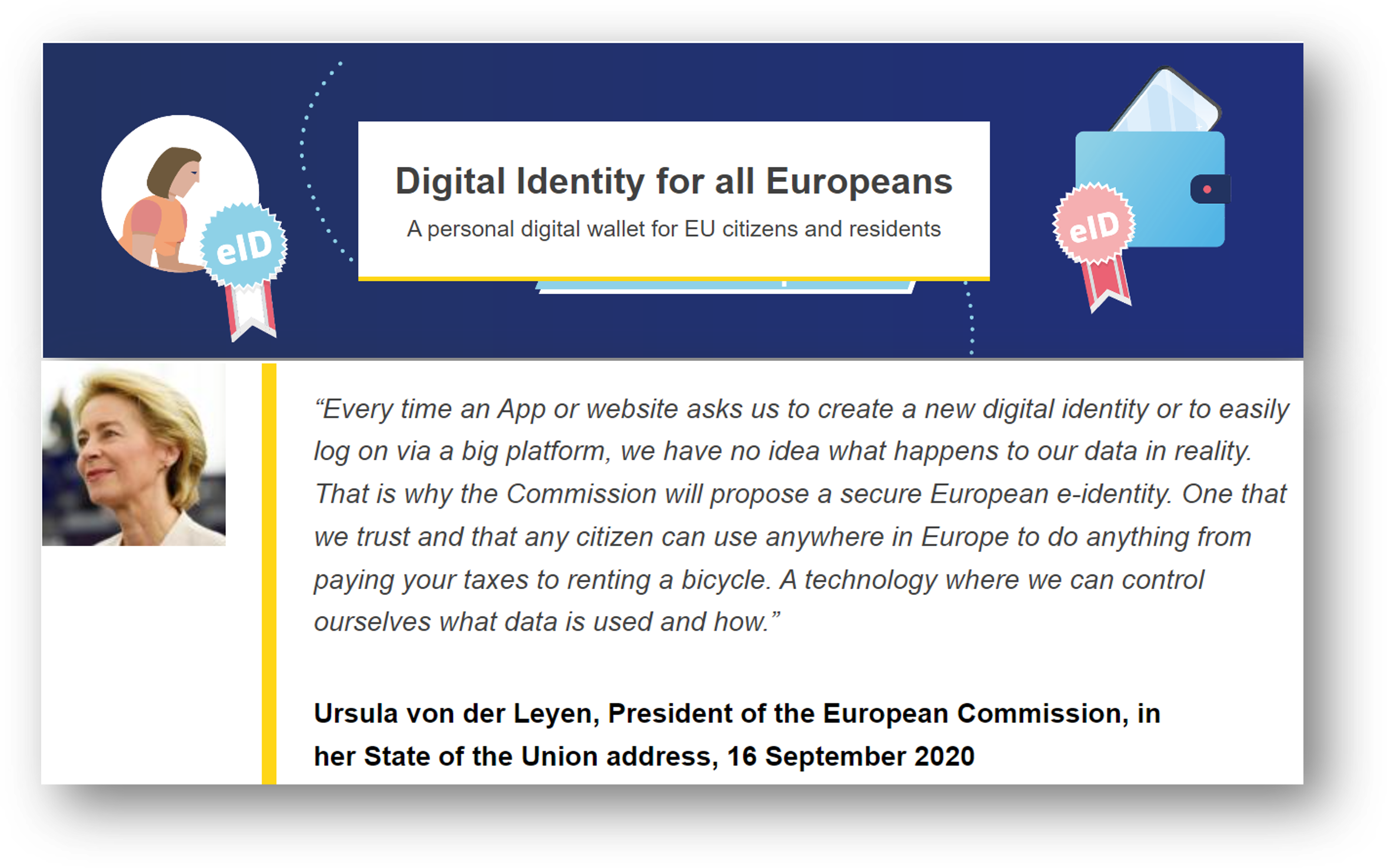 În 2014, UE a emis Regulamentul privind Identificarea Electronică, Autentificarea și Serviciile de Încredere (eIDAS), care cere statelor membre să stabilească scheme naționale de identificare electronică ce respectă standarde tehnice și de securitate. Aceste scheme trebuie interconectate, permițând cetățenilor să folosească identitatea electronică națională pentru a accesa servicii online în alte țări ale UE.